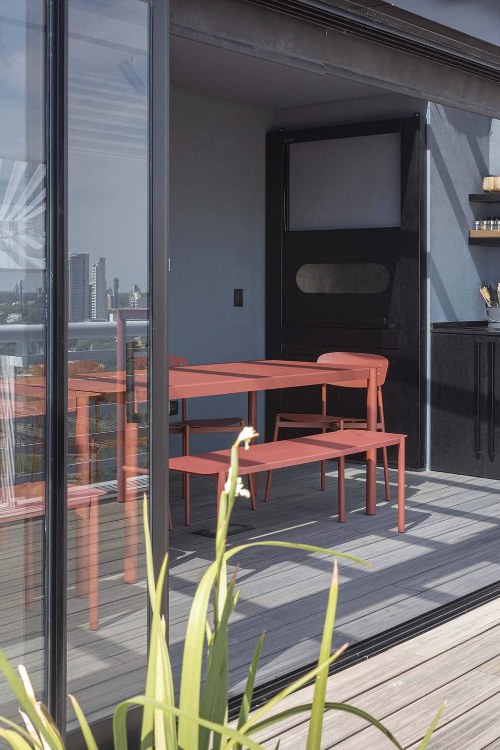 Este quincho/estudio busca integrar de manera fluida el trabajo y la vida en el hogar, convirtiéndose en uno de los espacios más especiales de la residencia. La cubierta de vidrio, que se abre al cielo, y las amplias ventanas orientadas al río generan una armonía visual que se refleja en toda la composición arquitectónica.