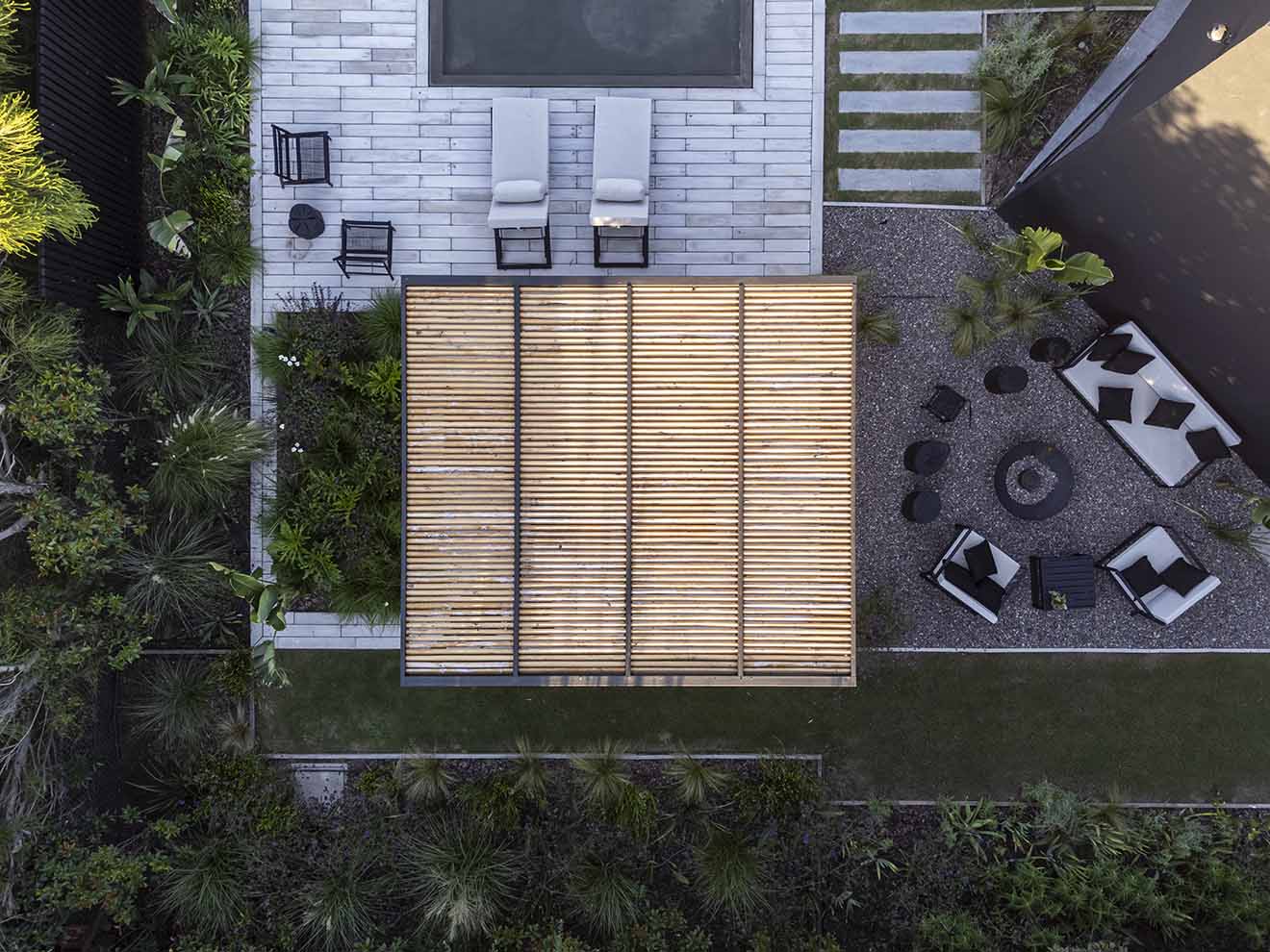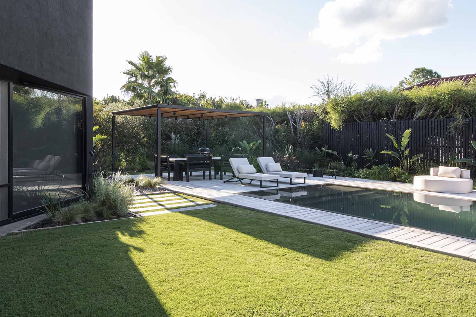 El gran desafío de esta obra fue mantener la arquitectura original de la vivienda diseñando un espacio de pérgola con piscina, parasoles remarcando la linealidad de las ventanas y un nuevo diseño de paisajismo e iluminación que consolida la estructura con estilo contemporáneo de volúmenes puros.