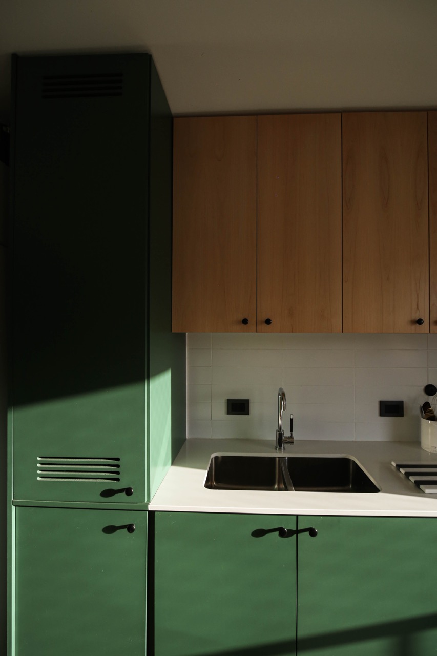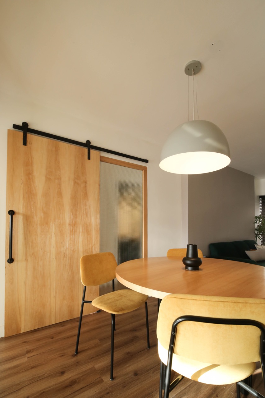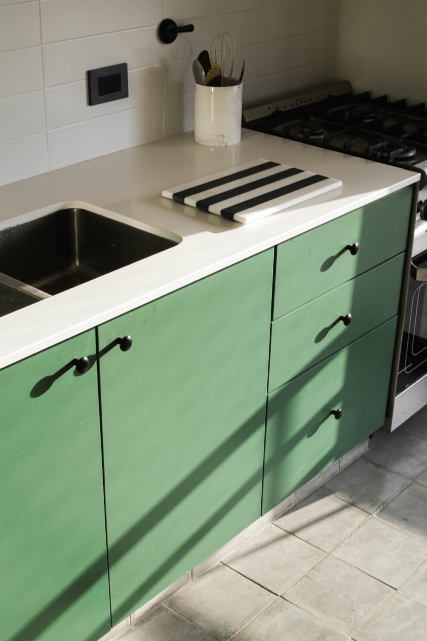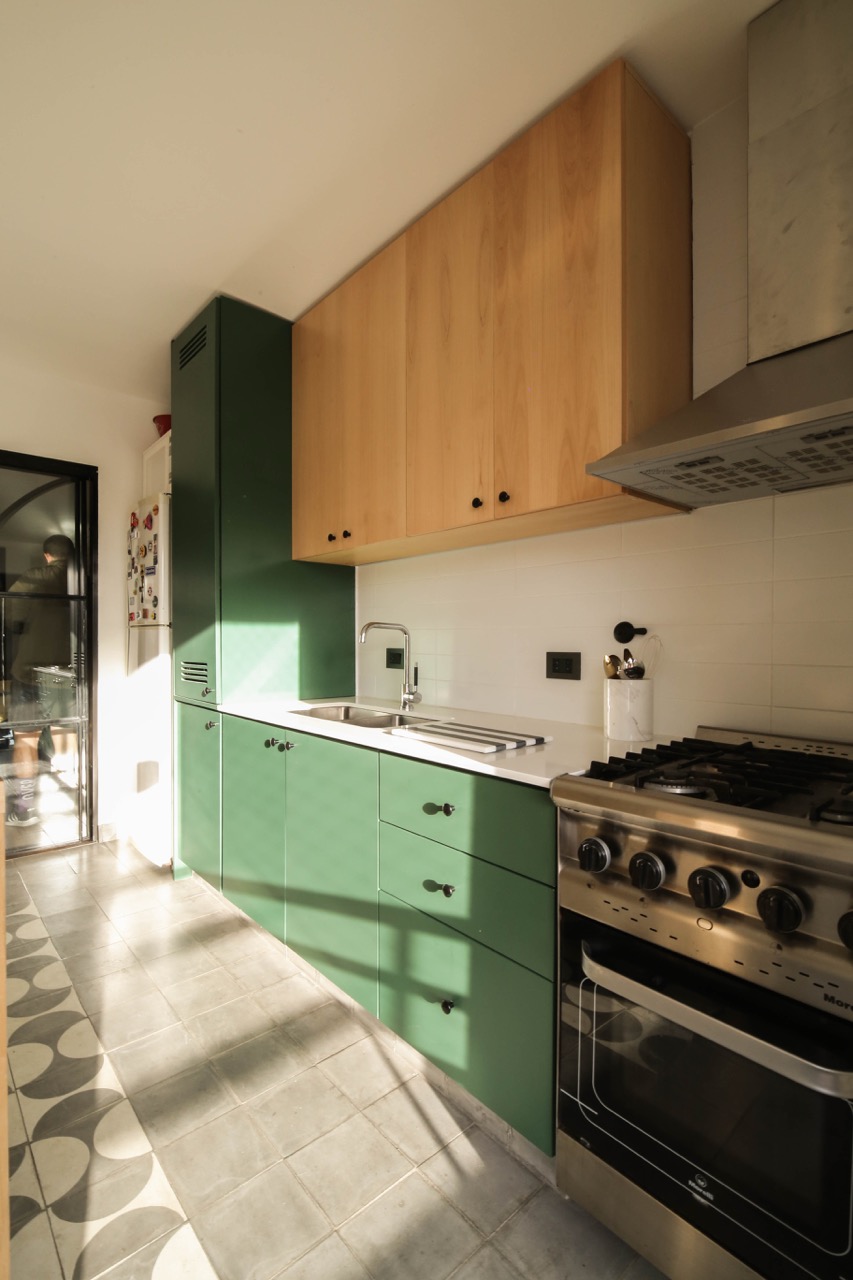 El proyecto enfrentó dos grandes desafíos: la baja entrada de luz natural y la falta de conexión entre los espacios. La solución consistió en abrir y ampliar vanos, incorporando aberturas según las necesidades de cada ambiente. La intervención principal fue la demolición del muro entre la cocina y el estar-comedor, reemplazado por una abertura de vidrio repartido que mejoró la fluidez sin perder funcionalidad. Como sello distintivo, se utilizó el color verde como protagonista en varios sectores.