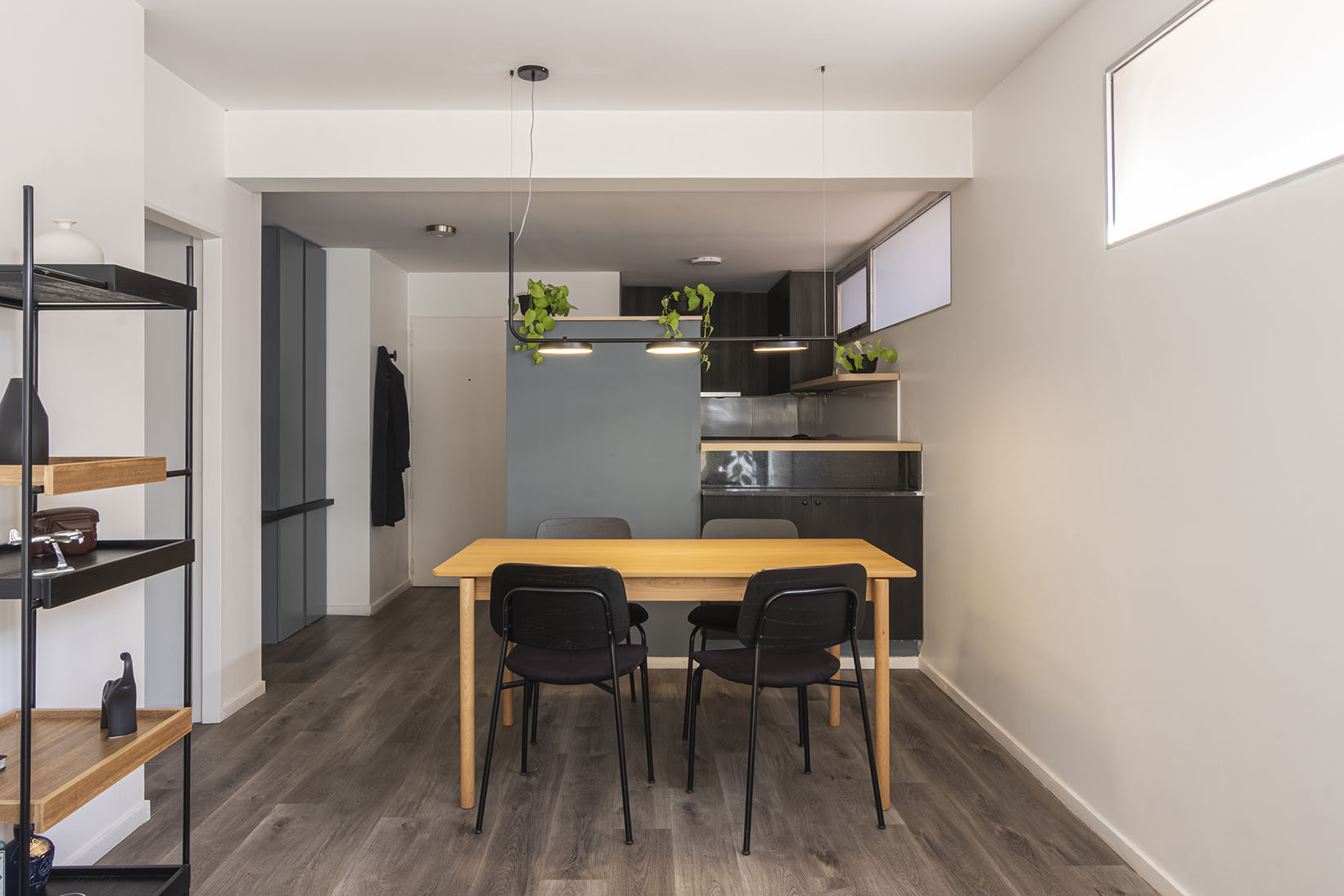 En este departamento de 55 m², el estar y el comedor comparten un mismo espacio, manteniendo un diálogo abierto que se extiende hasta la cocina.
