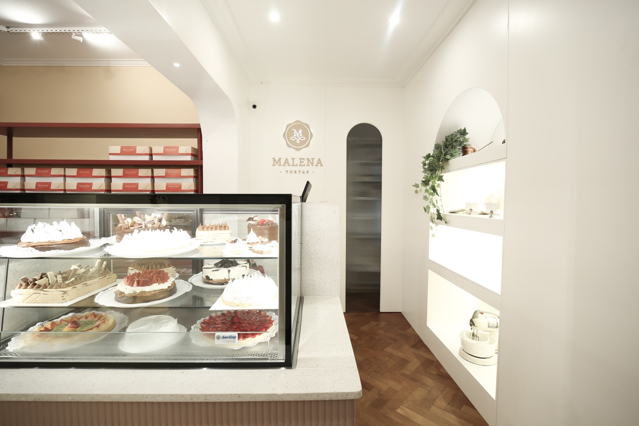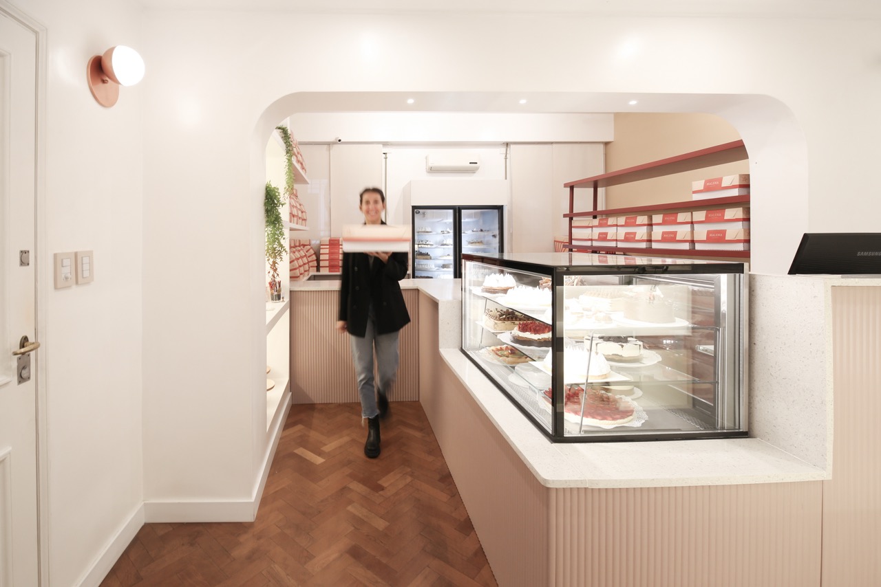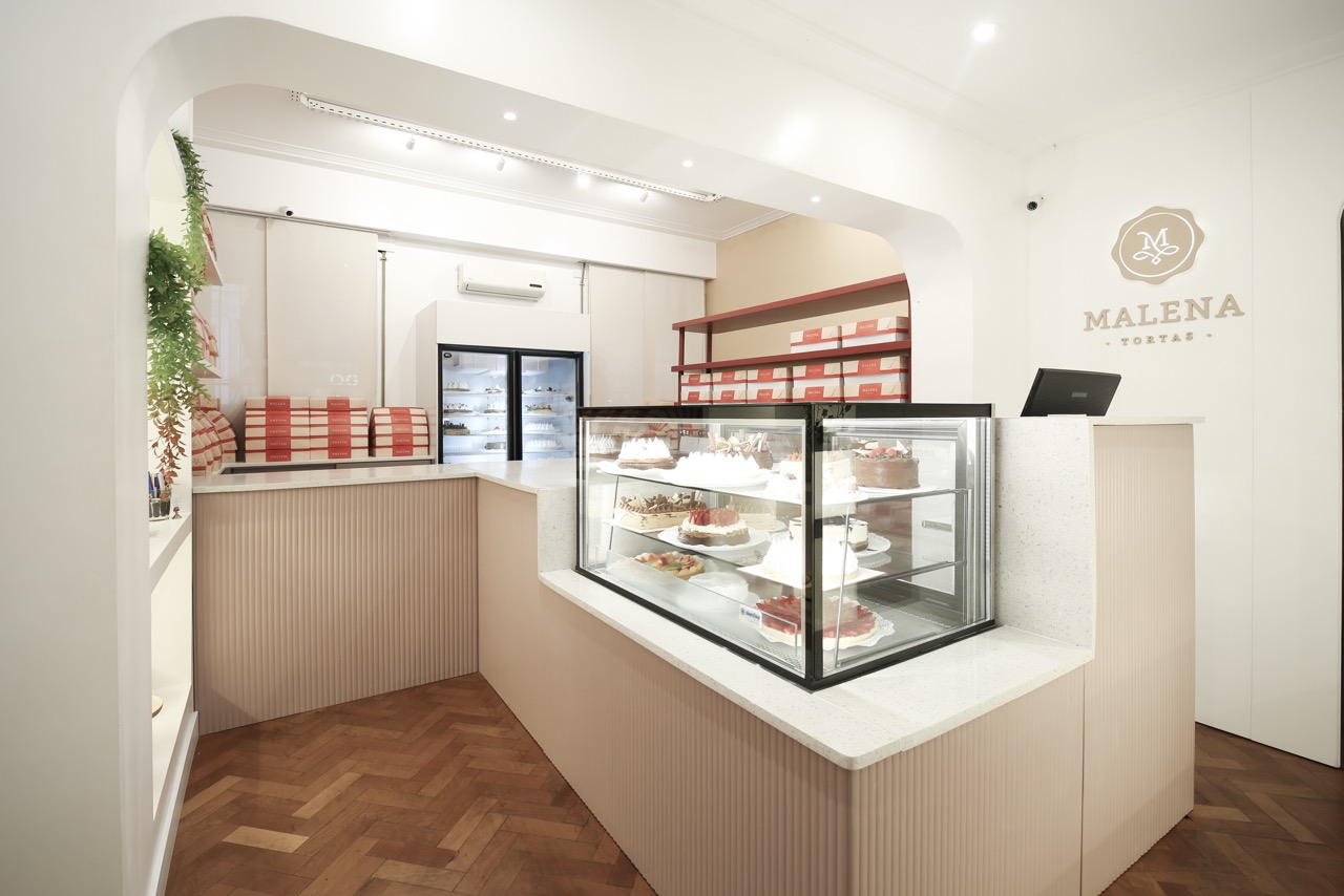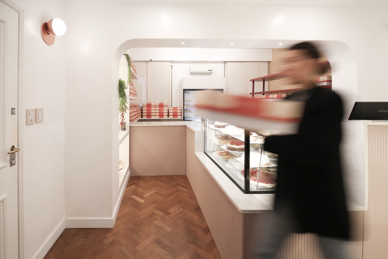 A la paleta cromática definida por la marca se sumó el desafío del mobiliario diseñado a medida, las curvas y otros elementos que coexisten en un espacio reducido. El reto fue lograr una mezcla armoniosa y equilibrada que acompañe la historia de esta reconocida pastelería, creando un ambiente que trasciende las recetas.