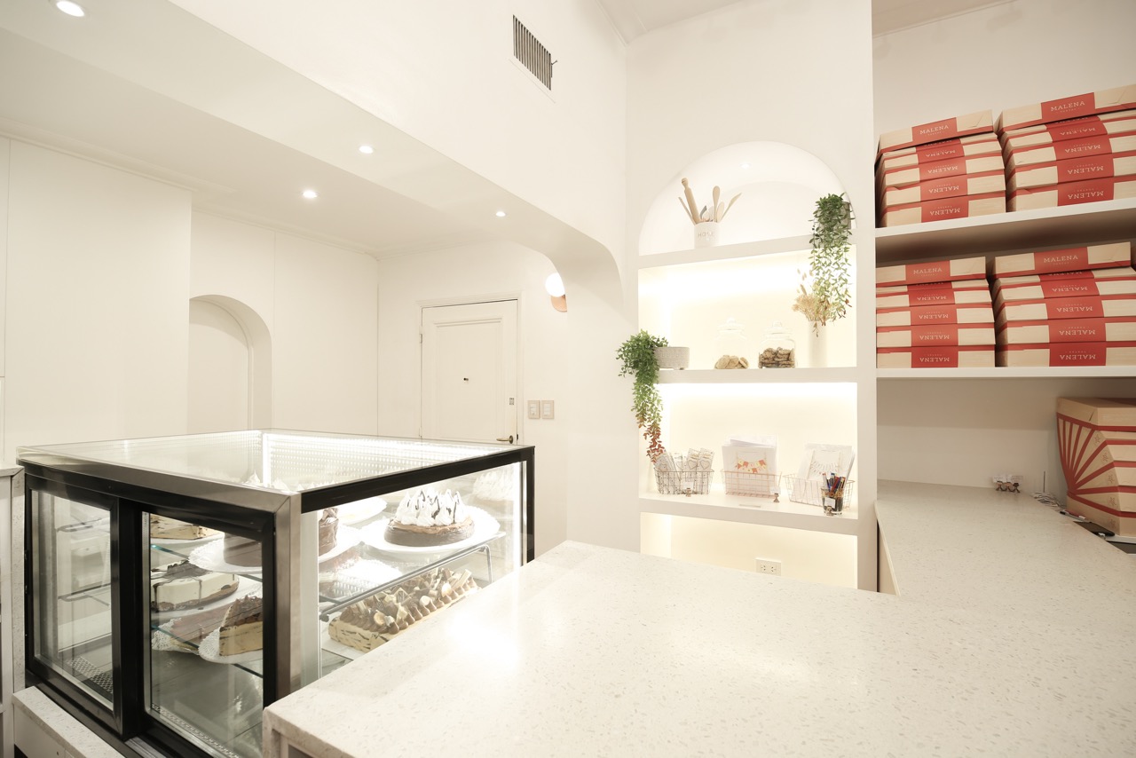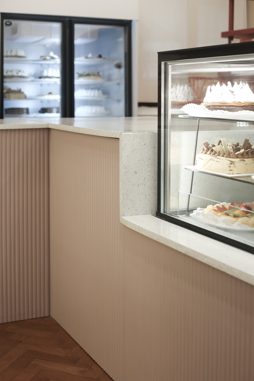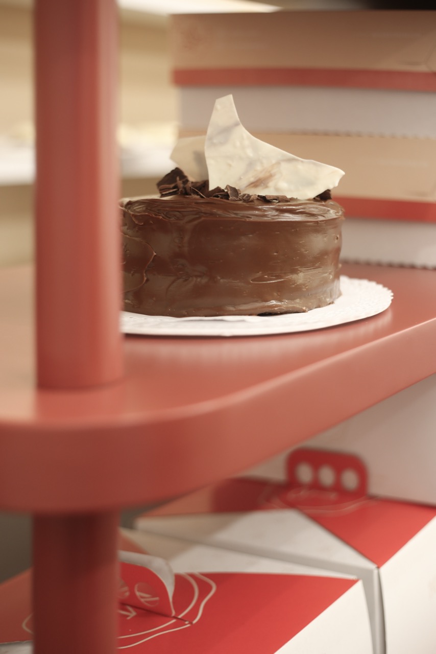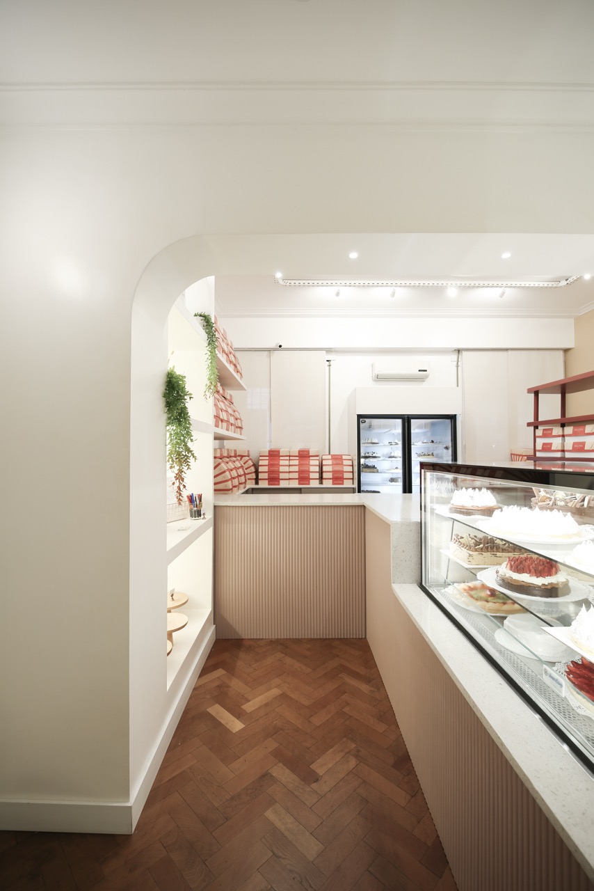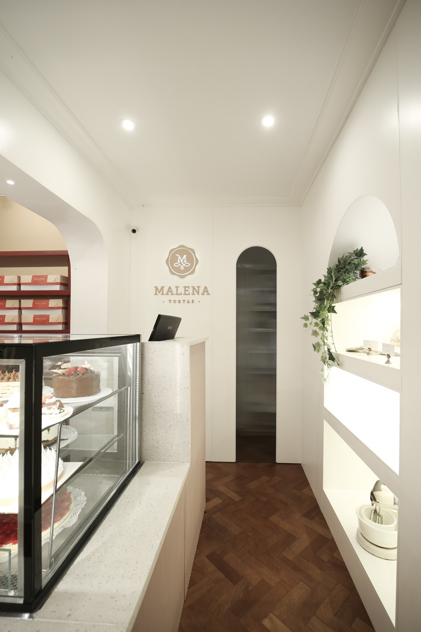 A la paleta cromática definida por la marca se sumó el desafío del mobiliario diseñado a medida, las curvas y otros elementos que coexisten en un espacio reducido. El reto fue lograr una mezcla armoniosa y equilibrada que acompañe la historia de esta reconocida pastelería, creando un ambiente que trasciende las recetas.